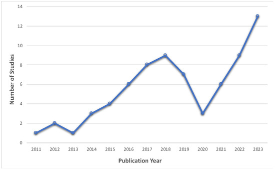 The annual publication trend indicates the level of attention given to a specific field of study by both researchers and industry practitioners. Figure 4 presents the yearly publication pattern for the current study. Despite having no restrictions on the publication year of the articles, the first relevant paper on the use of SM in DM emerged in 2011. This is not surprising, as a noticeable number of studies on the topic were published around 2010, following a very limited publication period of 2006–2010 [24]. Since then, the utilisation of SM in DM studies grew gradually until 2020, in line with the previous reviews of Ogie et al. [4] and Fauzi [24]. However, a slight decline in publications was observed in 2019 and 2020, possibly due to the shifted focus towards COVID-19 research. Nevertheless, there was a significant increase in the number of studies from 2020 to 2023. The number reached its peak with 13 articles in 2023. Overall, there was little and varied progress in the articles published on SM in DM until 2020, and the annual trend of published articles dramatically increased afterwards.