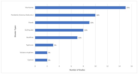 As shown in Figure 5, hurricanes, pandemics, floods, earthquakes, and bushfires were the most prevalent disasters highlighted in the systematic review. From the reviewed literature, one-fourth (25%) of the papers discussed hurricanes, followed by the pandemic (16%), floods (15%), earthquake (13%), and bushfires (11%), respectively. Apart from the greater frequency of these disasters in the world, the high appearance of these disasters in the reviewed literature resulted from the geographical bias in the reviewed literature towards countries like the United States and Australia, as evident in Section 3.1.2. For example, the most common natural disasters in the 2010s (2010–2019) in the United States included hurricanes, floods, tornados, and bushfires, whereas, in Australia, the most common disasters included were bushfires, floods, and storms [98,99,100]. Additionally, Figure 5 excluded the least reported disasters, such as storms, landslides, tornadoes, heatwaves, and tsunamis, as they appeared only once in the reviewed literature.
