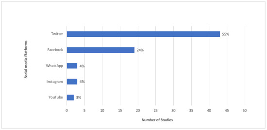 The effective management of these disasters was mostly investigated using Twitter as the key SM platform, as depicted in Figure 6. Twitter was used in 55% of the articles, while Facebook, WhatsApp, and Instagram were used in 24%, 4%, and 4% of the articles, respectively. All these predominant SM platforms are more common and well known among social communities. However, this review identified platforms like Myspace, TikTok, Snapchat, Nextdoor, WeChat, Weibo, and Telegram as the least appearing platforms in the literature. Geographical bias, age cohorts, and low popularity might be the reasons for reduced investigations on these platforms by researchers. For instance, being domestic apps, WeChat and Weibo were mostly used in Chinese studies only. TikTok and Snapchat, on the other hand, are still popular with the younger community. With the increasing number of users, especially among younger generations, who are expected to bear the burden of addressing future disaster risks, these platforms may evolve into a leading platform for future DM [4]. Hence, it will be important for future research to explore the possible and effective use of such platforms in DM.