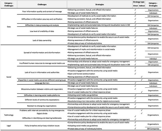 The first set of strategies to overcome the challenges of SM use is organisation-related strategies. This includes all government and non-government organisations and agencies in the context of DM. As discussed previously, SM platforms are not yet considered a formal tool by officials to rely on during disasters. Instead, SM platforms are kept as a side tool. Therefore, strategies like comprehensive policy developments, the establishment of SM use guidelines, and the integration of SM with incident management systems can play a pivotal role in formalising SM use. For this to be possible, a broad policy framework is required that addresses user behaviour, information confidentiality, integrity, and availability when accessing data or distributing government information [30]. SM use guidelines, on the other hand, should address the best practices in emergencies that are valid across organisations to enable the inter-organisational overcoming of emergencies [29]. Additionally, integrating SM with existing incident management systems will enhance the useability of SM as a formal tool to manage disasters [11,82]. Particularly, public safety answering points (PSAPs) and emergency response systems (e.g., wired 911 emergency response system) are required to integrate with available SM platforms. Such integrations are already seen in some areas. For instance, an adaptable PSAP system, named Next Generation 911, is already being used in some parts of the United States [11].