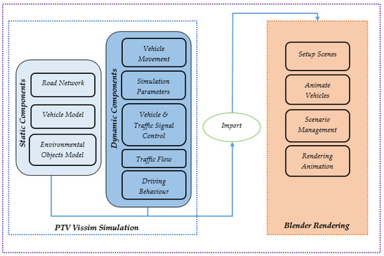 Within PTV Vissim, the road network, comprising lanes, intersections, and traffic signals, is systematically designed. Different vehicle types and routes are created, and the acceleration and maximum speed of each vehicle type are determined. To attain realism, driving behaviour is calibrated by adjusting characteristics such as the acceleration rates and following behaviour. Vissim simulates the traffic flow and observes vehicle interactions. Once the simulation is complete, Vissim exports the data as animation files. These data are then imported into Blender to produce a 3D scene mirroring the Vissim road network. Vehicles within the scene are animated, and their movements are accurately simulated using imported trajectories (Figure 1). The rendering settings are configured for the optimal results, and cameras and lights are positioned to capture the desired angles. The blender renders the animation, generating simulation frames [23,24,25,26,27,28]. The process of visualising the simulated traffic dynamics concludes with the animation being exported as a video file.