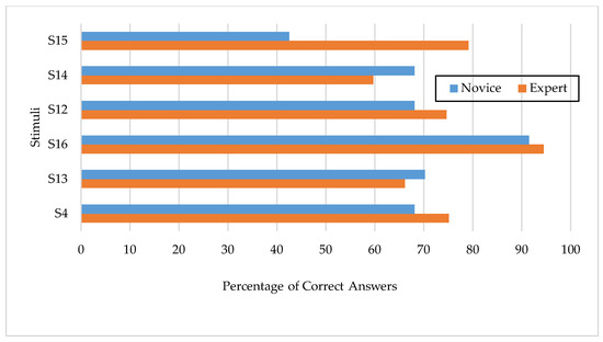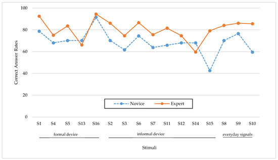 In this section, the respondent groups’ answers to the alternatives for each stimulus’s meaning were compared. In the current study, the most popular choice of stimulus was always considered to be the right one, which also corresponded with the results of a study by Adedeji and Feikie [1]. The option that was determined to be correct in the stimulus-generating process and the signal comprehension score was always the same as the correct response [12]. These outcomes confirm that the process for creating experimental stimuli is valid. Figure 3 shows the correct answer rate for the two classes of drivers (novice and expert). While the expert group had good overall accuracy, as expected, the novices were more accurate on two stimuli, S13 “Blinker of a car turning left onto off-ramp” and S14 “Hazard lamps of a car stopping roadside”, which fall into the formal and informal categories. The accuracy of the novices for S13 and S14 could be due to the novelty of the driving lessons and tests, while S14 is one of the most popular informal signals (Figure 4).