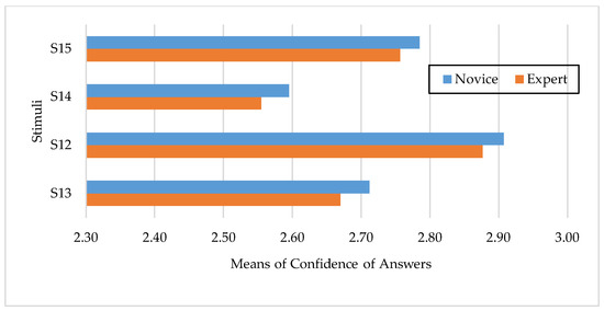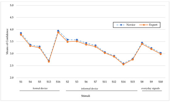 The mean confidence levels of the responses by participant group and stimulus are displayed in Figure 5. The mean confidence of the experienced drivers was not significantly different from that of the novice drivers; nonetheless, the novice drivers tended to have higher levels of confidence overall. For S12, S14, and S15, there were clear disparities in the novice drivers’ confidence regarding informal signals and S13 for the formal signals (Figure 6), which might have resulted from the lower percentage of novice drivers participating in the study. Furthermore, an analysis based on the respondents’ gender and mean confidence was conducted, and the results also showed that there was no significant difference between the male and female drivers’ responses.