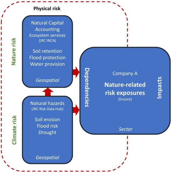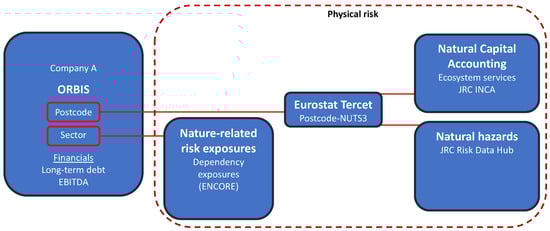 This study focuses solely on ecosystem dependency and climate (physical) risks (see Figure 1). European data on the former are provided by the European Commission’s Joint Research Centre (JRC) Integrated Assessment of Ecosystem Services (INCA) project in the form of ecosystem accounts, and the JRC Risk Data Hub (RDH) provides natural hazard data for Europe (see https://ecosystem-accounts.jrc.ec.europa.eu/ (accessed on 29 December 2023) and https://drmkc.jrc.ec.europa.eu/risk-data-hub/ (accessed on 29 December 2023)). A sector or firm that is highly dependent can suffer higher costs or even production failure in the case of an ecosystem services interruption. For this reason, we inform the share of highly exposed firms with geospatial data on exposures concerning local ecosystem provisioning shortage and natural hazards. In addition, we complement natural hazard metrics, which are complementary and studied in the context of physical climate risks. An ecosystem dependency (physical risk) block, as proposed in this paper, and an ecosystem impact (transition risk) building block would be necessary to run a comprehensive nature-related stress test.