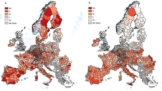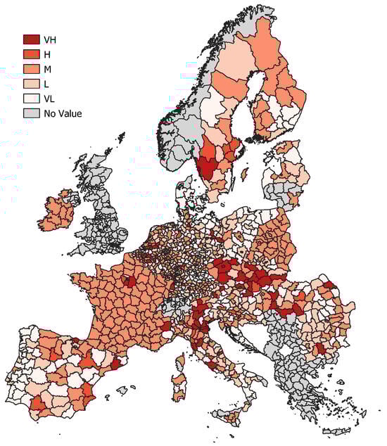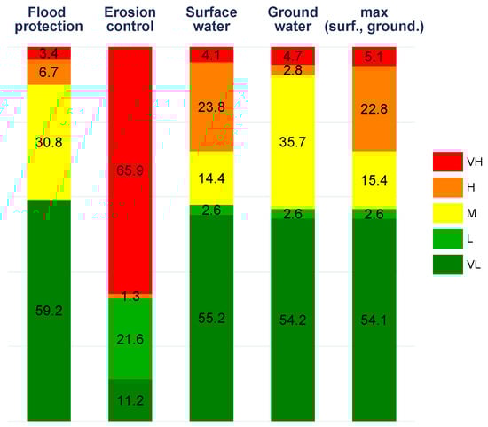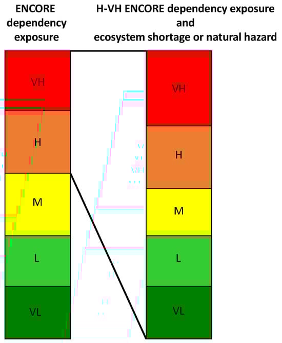 which results in a metric indicating insufficiency of ecosystem provision if larger than 1. Negative values are discarded, as unmet demand cannot exceed demand, indicating that those values might result from measurement errors, potentially due to geographically complex structures. We assign materiality ratings (Very Low (VL), Low (L), Medium (M), High (H) and Very High (VH)) for ecosystem underprovisioning based on the thresholds outlined in Equation (2) and geospatially illustrated in Figure 6.