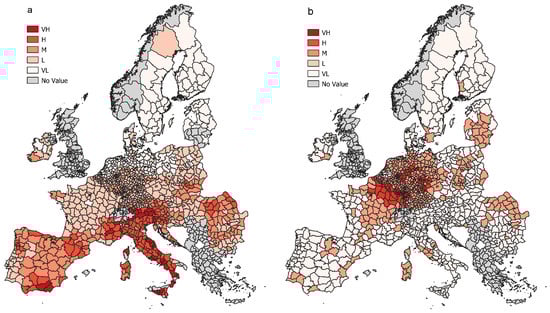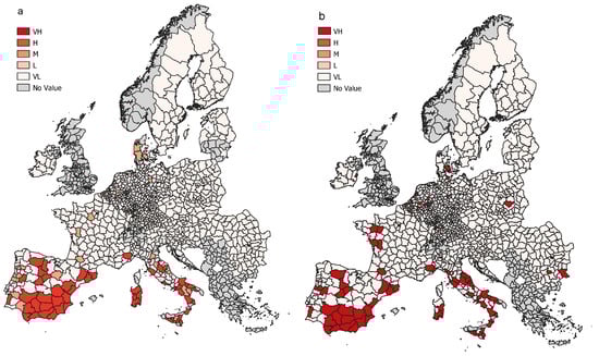 Ecosystem provisioning shortage, (a) flood protection and (b) soil retention. Source: JRC elaboration.