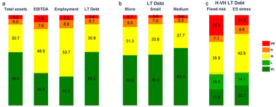 (a) Flood and storm protection ecosystem service dependency exposure of firm key variables, (b) long-term debt by firm size, and (c) flood risk and ecosystem provisioning shortage exposure as a share of High to Very High-exposed long-term debt. Source: JRC elaboration.