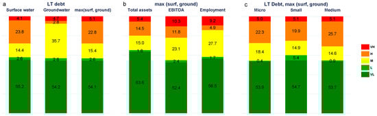 (a) Encore different water dependency exposures of long-term debt, (b) maximum water exposure measure of firm key variable and (c) maximum water exposure measure by firm size. Source: JRC elaboration.