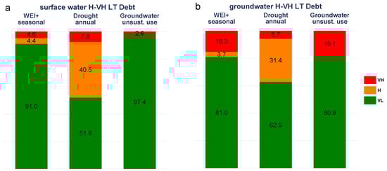 Long-term debt exposure to Water Exploitation Index + seasonal, annual drought and unsustainable groundwater as a share of long-term debt exposed to High to Very High (a) surface water and (b) groundwater. Source: JRC elaboration.