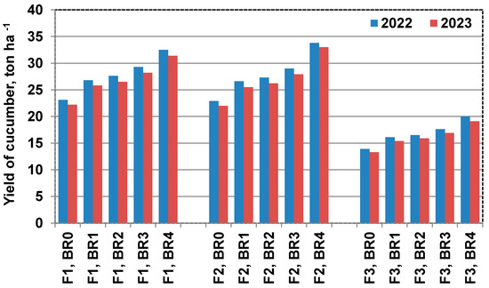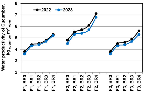 | Irrigation Deficit | Biochar Rate, ton ha−1 | Yield of Fruits, (ton ha−1) | Water Productivity (kgcucumber m−3water) | ||