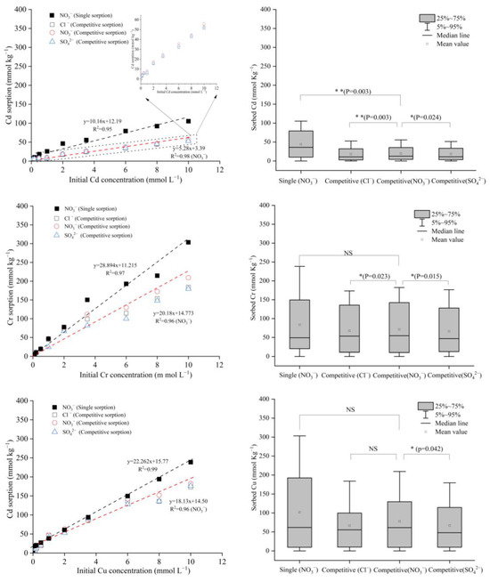 The physical, chemical, and biological reactions of HMs in solution with various components of soil determine the reaction behavior of HMs at the soil–liquid interface. The results of the single-cation sorption experiments and competitive sorption experiments are shown in Figure 1 (left). There is a significant difference in the adsorption performance between Cd, Cr, and Cu under the same conditions (p < 0.001). The slope coefficient values of the Cd2+, Cr3+, and Cu2+ sorbed in the single cation experiment are 10.27, 28.89, and 22.26, respectively, which are very different from the slope values for competitive sorption (5.39, 20.18, and 18.13). The results in Figure 1 suggest that Cd2+ was found to be the most competitively inhibited cation, and its single-cation sorption capacity showed a significant difference compared to the results of competitive adsorption experiments (p = 0.003); however, no significant difference was found for Cr3+ (p = 0.054) or Cu2+ (p = 0.083).
