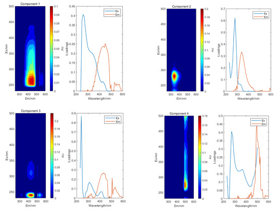 Figure 2 illustrates the fluorescence spectra of the DOM components. Four individual components were identified by a PARAFAC analysis from natural soil-derived DOM. The sum of squared residuals and split half validation of PARAFAC can be found in Figures S1 and S2. OpenFluor, an online spectral library of autofluorescence in organic compounds, provides us with a method to characterize naturally occurring organic matter [45]. Component 1 (Ex/Em maxima: <260(320)/450 nm) and component 3 (Ex/Em maxima: 240(310)/430 nm) are usually described as humic-like components of terrestrial origin [46,47,48], while component 2 (Ex/Em maxima: <280/330 nm) resembles free and bound protein-like components [49]. The fluorophore of C2 exhibited EEM peaks resembling those of tyrosine-like components [17]. Component 4 (Ex/Em maxima: 260(360)/490 nm) has been reported to be a reduced quinone-like component and has been identified in DOM from a wide variety of aquatic systems [35,50]. Component 4 has also been found in many DOM samples from plant biomass and animal manure [51].