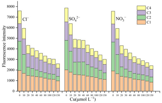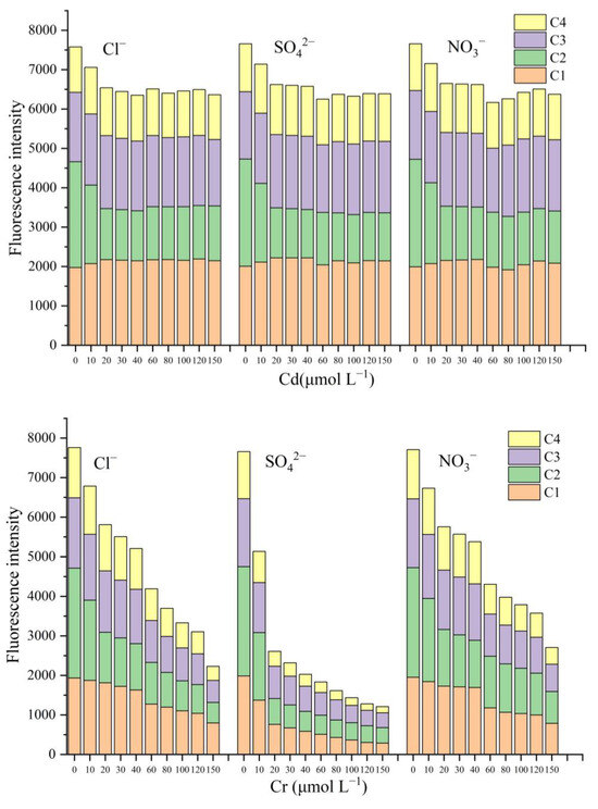 From the fluorescence quenching titrations with different coexisting anions, as seen in Figure 3 and Figure S3, it can be observed that the presence of SO42− enhanced the degree of complexation between Cr3+ and each component (C1: p = 0.004, C2: p = 0.61, C3: p = 0.085, C4: 0.011 vs. Cl−, C1: p = 0.007, C2: p = 0.189, C3: p = 0.038, C4: 0.008 vs. NO3−), with the total fluorescence intensity being 0.44 times (NO3−) and 0.54 times (Cl−) what it was in the presence of the other two coexisting anions alternatively (150 μmol/L). Multiple comparisons, by ANOVA, of the quenching titrations (Table S2) indicated that all significant differences were found in the system with SO42− as the anion. The fluorescence quenching titration results show that protein components have a better affinity for Cd2+, Cr3+, and Cu2+ than humic-like components. This is similar to previous research [31,54].