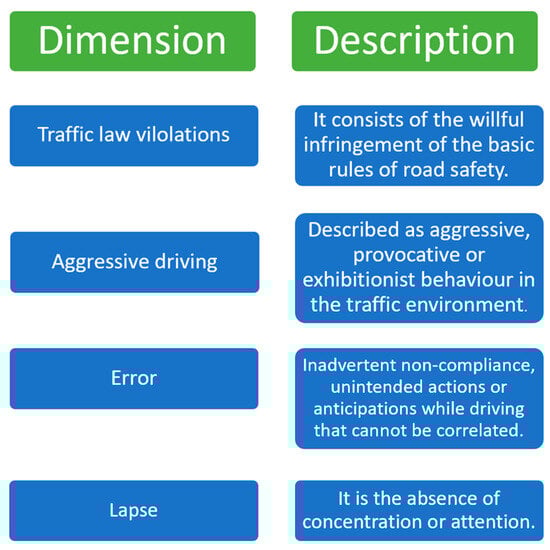 The DBQ is used to identify unsafe driving behaviors []. These behaviors include poor driving behavior, lack of concentration, aggressive attitudes, and infractions or violations of traffic regulations [,]. In line with the search for risk factors in road traffic crashes, the use of the DBQ provides data to identify the main characteristics that separate cautious drivers from high-risk drivers [,,]. In this way, road safety prevention strategies can be developed, and the different elements involved in road crashes can be understood.