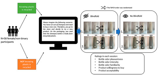 While consumers’ acceptability can relate to different aspects of the product lifecycle, such as safety, environmental footprint, fair labor, or price, sensory properties are central to driving expectations, choice, acceptability, and repurchase. The relevance of the sense of smell for consumer behavior has already been acknowledged within the framework of sensory marketing and embodied cognition [32], especially concerning memories and emotional connections [33]. However, sensory marketing research on smell perception has mostly focused on the effect of ambient scenting on consumers’ moods and purchase intentions [34,35,36,37], while little attention has been given to the effect of the packaging scent [38]. In this study, we investigate the relationship between the percentage of PCR included in the bottles, their odor qualities, i.e., pleasantness, familiarity, and intensity, and consumers’ PEPs. Based on the research efforts to deodorize PCR to broaden its application [27,28,29,30,31], we expect that an increased percentage of PCR will decrease odor pleasantness and familiarity and increase odor intensity, which will relate to a decrease in acceptability and willingness to buy.