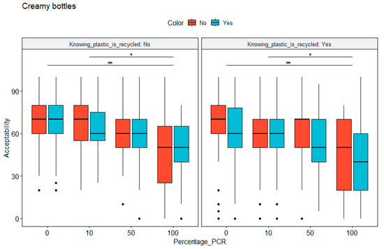 Box plots of the effect of the percentage of PCR and color on the acceptability of the creamy bottles. The central line in each box denotes the median, the boxes contain the first and third quartiles, and the whiskers mark the lowest and highest data points. The asterisks indicate significant (* = p < 0.05, *** = p < 0.001) effects from the Bonferroni-corrected post hoc tests.