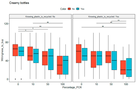 Box plots of the effect of the percentage of PCR and color on the willingness to buy the creamy bottles. The central line in each box denotes the median, the boxes contain the first and third quartiles, and the whiskers mark the lowest and highest data points. The asterisks indicate significant (* = p < 0.05, ** = p < 0.01, *** = p < 0.001) effects from the Bonferroni-corrected post hoc tests.