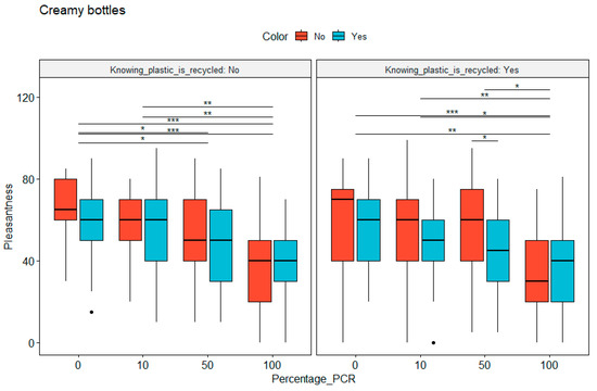 Box plots of the effect of the percentage of PCR and color on the odor pleasantness of the creamy bottles. The central line in each box denotes the median, the boxes contain the first and third quartiles, and the whiskers mark the lowest and highest data points. The asterisks indicate significant (* = p < 0.05, ** = p < 0.01, *** = p < 0.001) effects from the Bonferroni-corrected post hoc tests.