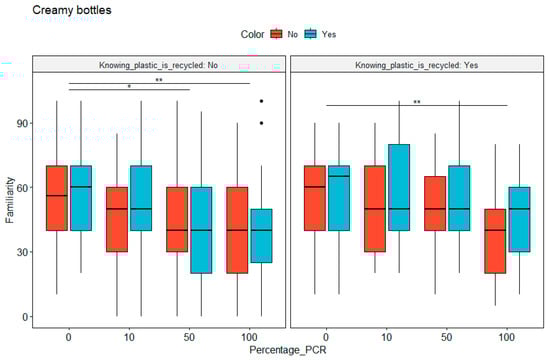Box plots of the effect of the percentage of PCR and color on the odor familiarity of the creamy bottles. The central line in each box denotes the median, the boxes contain the first and third quartiles, and the whiskers mark the lowest and highest data points. The asterisks indicate significant (* = p < 0.05, ** = p < 0.01) effects from the Bonferroni-corrected post hoc tests.