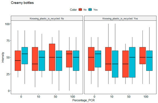 Box plots of the effect of the percentage of PCR and color on the odor intensity of the creamy bottles. The central line in each box denotes the median, the boxes contain the first and third quartiles, and the whiskers mark the lowest and highest data points.