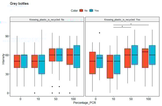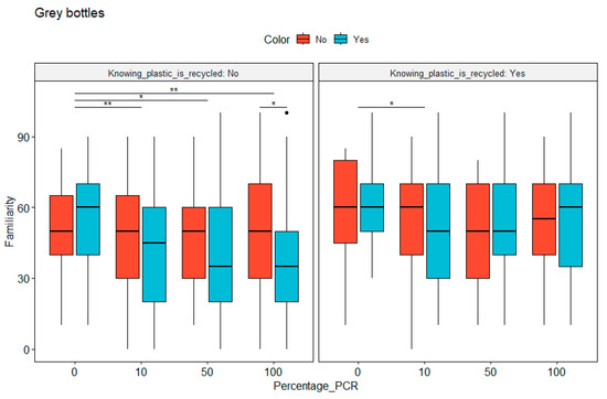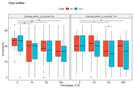 Box plots of the effect of the percentage of PCR and color on the acceptability of the grey bottles. The central line in each box denotes the median, the boxes contain the first and third quartiles, and the whiskers mark the lowest and highest data points. The asterisks indicate significant (* = p < 0.05, ** = p < 0.01) effects from the Bonferroni-corrected post hoc tests.