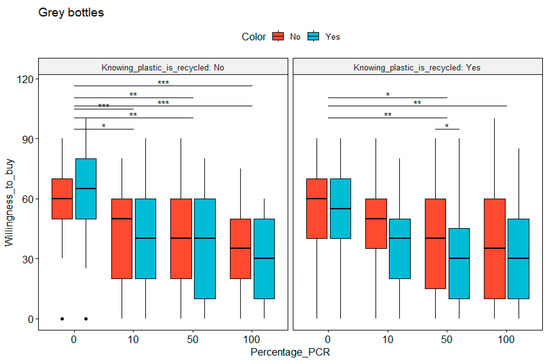 Box plots of the effect of the percentage of PCR and color on the willingness to buy the grey bottles. The central line in each box denotes the median, the boxes contain the first and third quartiles, and the whiskers mark the lowest and highest data points. The asterisks indicate significant (* = p < 0.05, ** = p < 0.01, *** = p < 0.001) effects from the Bonferroni-corrected post hoc tests.