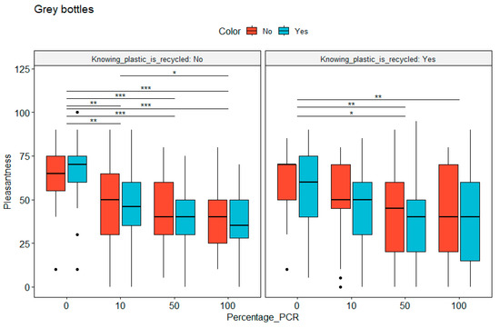 Box plots of the effect of the percentage of PCR and color on odor pleasantness of the grey bottles. The central line in each box denotes the median, the boxes contain the first and third quartiles, and the whiskers mark the lowest and highest data points. The asterisks indicate significant (* = p < 0.05, ** = p < 0.01, *** = p < 0.001) effects from the Bonferroni-corrected post hoc tests.