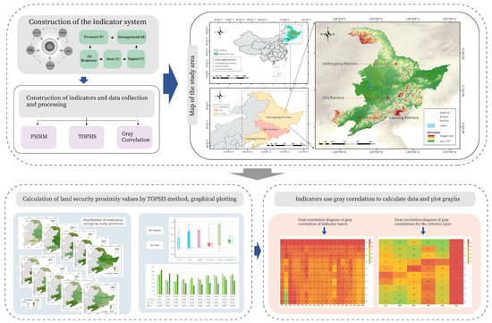 Considering the background information given above, the three northeastern provinces of China, which comprise China’s primary grain-producing region, are selected as the research object. In the research process, it is found that due to the fuzziness and uncertainty of the land’s safety information and the complexity of influencing factors, the traditional TOPSIS method based on the exact number is not suitable for dealing with fuzzy data and information. Therefore, using the theoretical model of “Pressure-State-Impact-Response-Management”, with the help of Entropy-TOPSIS and gray correlation analysis, the fuzzy TOPSIS of information entropy power combined with gray correlation analysis can minimize the personal subjective influence during the evaluation of the program, and at the same time, reduce the distortion of the information, so as to make the evaluation results more objective and accurate, which is of guiding significance for decision making on the program of enhancing the security of land resources. The study puts forward a proposed viewpoint for protecting land ecological security in the three northeastern provinces, aiming to characterize the evolutionary trend of land ecological security status in the three northeastern provinces from 2012 to 2021. The study’s findings offer a solid scientific foundation for the proactive advancement of ecological land security by utilizing the land’s potential and promoting sustainable socioeconomic growth in the three provinces in the northeast. It also provides cases and references for land ecosystem management. The research idea is as follows (Figure 1).