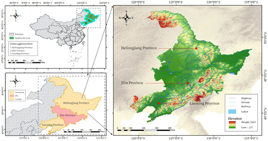 Because of their disparate natural environments, the three provinces in the northeast are diverse from one another. Liaoning Province has a high topography, situated in the hilly western region and the mountainous eastern region, with average altitudes of 800, 500, and 200 m above sea level, making up, respectively, 38%, 26%, and 36% of the province’s entire surface area. The average annual precipitation in the region is 600 to 1100 mm, and it belongs to the continental monsoon zone [17] with rain and heat in the same season, long hours of sunshine, high cumulative temperatures, long winters, hot summers, short springs and autumns, and four distinct seasons [18]. Jilin province has uneven precipitation, featuring a dry climate in the western part of the country and a humid one in the southeast. The climate of Heilongjiang is marked by high summer temperatures and abundant rainfall, low spring temperatures and drought, frequent flooding in autumn, early frosts, long, cold winters, short frost-free periods, and marked climatic differences between regions. The three provinces in the northeast are quite sparsely inhabited, highly industrialized, and dominated by arid farming. The varieties of vegetation are varied and intricate, including deciduous coniferous forests, woods with temperate conifers, mixed deciduous forests, temperate forest-steppe, grasslands, and steppes. The three northeastern provinces are distinguished by their distinct vegetation distribution and are one of the hot spots of global climate change research.
