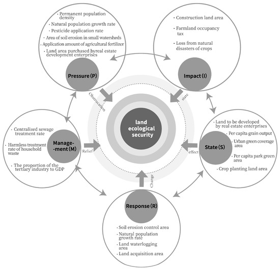 The ecological security of land resources can be evaluated using a variety of techniques, such as hierarchical analysis, fuzzy synthesis, gray correlation, principal component projection, etc. In this article, we adopt the PSIRM model, an improved model according to the PSR model. In this work, we adopt the PSIRM model, an improved model based on the PSR model, which includes more comprehensive factor elements, a broader scope and richer evaluation criteria. The PSIRM model includes more complete factorial elements, a broader scope of application and richer evaluation criteria [17]. (P) Pressure refers to indicators that show the environmental stresses brought on by both natural and human-caused sources. (S) State refers to the natural state of natural resources, environmental quality, and ecosystems as reflected in the natural state. (I) Impact refers to positive or negative impacts on land resources caused by human activities and the natural environment. (R) Response refers to the economic, administrative, and legal means adopted by humans following feedback from the natural world. (M) Management subsystems represent human impacts caused by human activities. And (D) Management systems represent human impacts on natural resources brought about by human activity and the natural environment. The management subsystem (M) represents the cost of proactive human responses and inputs due to changes in the state of the environment [18,19]. The PSIRM model starts from the interaction and influence of human society and effectively links natural resources and the socio-economy, which is more systematic, comprehensive, and distinctive in terms of causality, as well as simple and practical in terms of operation. Based on the above analysis, the PSIRM framework is established (Figure 3). The example can assist in analyzing the factors influencing land resources and can show how each aspect is interrelated.