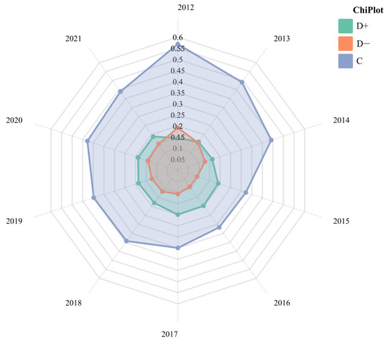 The sixth step was to determine the approximation value of the ideal solution. Setting “” as the approximation value, this demonstrates how near the ideal option is to the land’s supply of assessment object “i” natural carrying capacity. and the worth range is . When , it indicates that the land’s components have the highest ecological carrying capability; when , it denotes that the land’s resources have the lowest sustainable capacity for carrying goods. The precise equation is as listed follows: