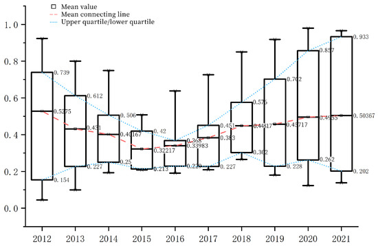 Box plot of land ecological security closeness in the three eastern provinces, 2012–2021.