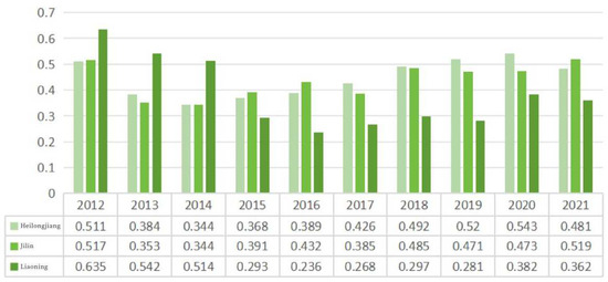 From a chronological standpoint, the relative land sustainability in the three northeastern provinces has been in the range of 0.317–0.569 over the past decade, with an overall upward trend. Regional land ecological security in the three northeastern provinces has been strengthened and improved. The relative ecological safety of the land revealed a decreasing trend from 0.569 to 0.322 from 2012 to 2015 and a gradual increasing trend from 0.317 to 0.439 from 2016 to 2021. This indicates that the three northeastern provinces have increased their investment in land ecological environment management since 2015. Local governments have taken measures to improve infrastructure and increased investment in the cause of improving the land’s environment.