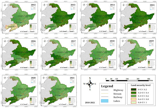 A graphic representation of the location of ecological land security levels in the three northeastern states from 2012 to 2022 was created by digital vectorization using ArcGIS 10.8 software (Figure 6 and Figure 7). The three provinces located in the northeast are included in the map, which shows the study region. The ecological land security level is shown by the color shade. The figure shows that the ecological land security level of Heilongjiang and Jilin Provinces is higher than that of Liaoning, which has the lowest relative ecological land security level. The legend defines the criteria for dividing the relative proximity value of ecological land security in each province and divides the quality of ecological land security in each province into five levels. From 2012 to 2021, in the three provinces, there was a decline in the standard of natural resource security, which then gradually rose and improved.