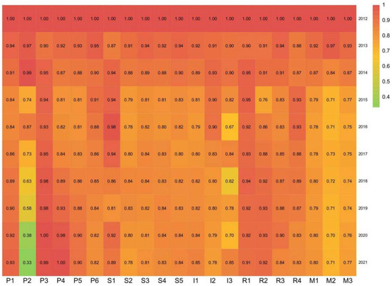 When indicator layers were constructed (Table 5), the gray correlations among the 21 indicators ranged from 0.723 to 0.96, with small correlation gaps among the indicators. The highest gray correlation was found in the erosion zone of the P3 sub-catchment, while the lowest was found in the natural population growth rate (P2). This indicated that natural factors were more closely related to land resources in 2012–2021. The small differences between the individual extreme values indicated that there was some degree of correlation among the indicators affecting the three northeast provinces and that the choice of indicators was reasonable.