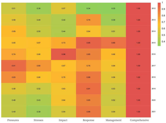Overall, the impact dimension exhibits a general tendency to plateau, drop, and then stay mostly steady. This is primarily due to the notable decrease in the arable land occupancy tax [23]. A unique levy, known as the arable land employment fee, was put in place to safeguard agricultural land as well as promote the wise use of land resources. Reducing the arable occupancy tax could encourage irrational land-related growth and use, which would weaken the environment’s safety net of these natural assets [24,25]. The overall response dimension shows an initial downward trend, followed by stagnation. Fluctuations in the two indicators of soil erosion control area and total afforestation area led to a significant drop in the response indicator in 2012–2014. However, in subsequent years (2014–2021), with focus on terrestrial ecological resources, government investment in terrestrial resource management has been strengthened and the terrestrial ecological security system is gradually recovering. The management dimension shows a general upward trend. This is mostly because the three northeastern provinces, which have experienced significant growth in both society and the economy, as well as an upgrade and transformation of the industrial structure, have expanded their investments in environmental control and protection. Annual increases have been observed in the rates of harmless domestic waste treatment and centralized wastewater treatment. Additionally, in 2021, the share of tertiary businesses in the GDP increased from 36.33% in 2012 to 51.29%. Investment in solving terrestrial ecological problems in the three eastern provinces has increased, and the local ecosystem safety index has been improved accordingly.