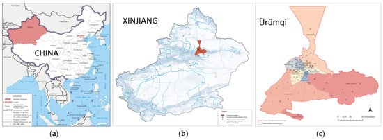 (a,b) Scope of this study; (c) Urumqi sub-district boundaries and zones.