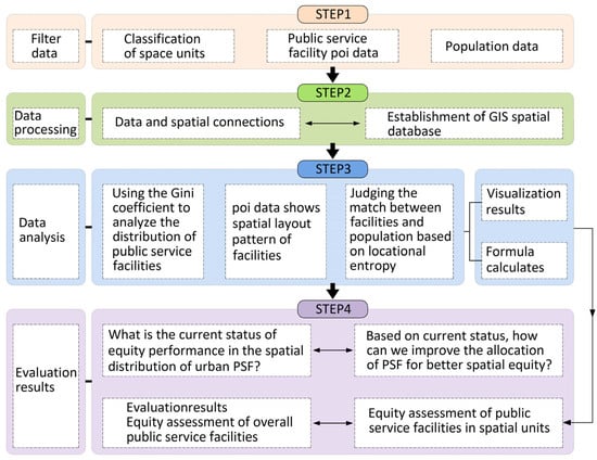 This paper applies Gini coefficients, commonly used in economics to measure income distribution, to evaluate the distribution of urban PSFs, and adopts the location entropy method, which analyzes the degree of industrial agglomeration, to compare the spatial distribution of resources with the spatial distribution of the population. In order to realize the matching calculation of the Gini coefficient and location entropy with population and space, the sub-district [44], the primary administrative unit in demographic analysis, was selected as the unit of delineation for this study. Based on the sub-district as the unit of calculation, spatial data (including sub-district boundaries, demographic data, and POI data for LSFs, PSKFs, and MFs), overlay calculations, and comparative analyses were conducted to evaluate equity at the spatial level quantitatively.