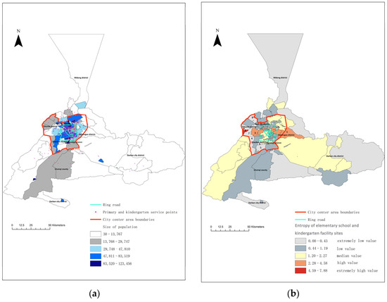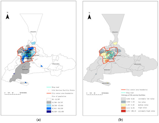 Combined with population distribution and facility distribution, the entropy results of PSKF zones have the following characteristics: the very-high-value sub-districts are mainly concentrated in low-population areas outside the Third Ring Road within the central district, while very-low-value sub-districts are scattered; the facilities are unevenly distributed spatially, with a higher concentration of facilities within the Third Ring Road and decreasing radioactively outwards. Therefore, the location entropy results are mainly related to the sub-district population; the number of very-low-value sub-districts is higher in the city’s central area (Figure 4b).