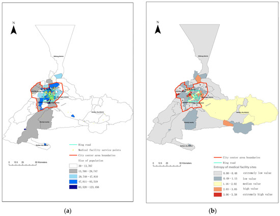 (a) Point density of MFs and population distribution; (b) entropy of medical facility point locations.
