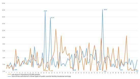 Based on the typical characteristics of the three categories summarized above, the sub-districts that generate very high values were characterized by a small population, such as Changshengnan sub-district, Wuyi Farm sub-district, Xishan Farm sub-district, and Anningqu Township. Changshengnan sub-district is situated on the city’s outskirts, within the warehouse district, and has a small population. Despite limited public services, the per capita benefits are substantial. Anningqu is a town that has mainly developed in the agricultural industry. Most of the area is dedicated to agricultural and industrial purposes, with minimal residential land and low building density. With a small population, the statistical data reflect a high per capita indicator. Two situations give rise to very low values: one is where very low values are found in central urban areas. These sub-districts generally have large populations, and although the number of facilities is intermediate, the per capita enjoyment is low. For instance, the Fengyuan sub-district in Shayibak District is in the city’s historic downtown area, characterized by a dense population and a high demand for public service amenities. Since most of the sub-districts are high-density commercial and residential land on the ground floor, there are more significant restrictions on construction, and there needs to be more space for public facilities to be set up, resulting in insufficient per capita enjoyment and low entropy of the district. At the same time, Yan’erwu is a sub-district of natural scenic beauty situated within a large zoning district, with a relatively concentrated population and a relatively limited number of private establishments in the immediate area. They calculate results based on the sub-district as a unit, which results in a low outcome.
