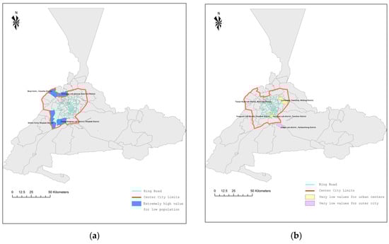 (a) Very-high-value sub-districts at the city’s edge; (b) very-low-value sub-districts in urban centers and remote suburbs.