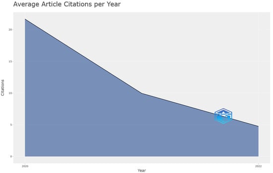 The average citation per article exhibited a noticeable decline from 25 citations in 2020 to fewer than 5 citations in 2022, reflecting a shift in the research landscape. This change suggests that papers published during the pandemic period enjoyed good visibility and recognition, but there has been a subsequent decrease in the interest of researchers in the study of happiness during COVID-19, as depicted in Figure 2.