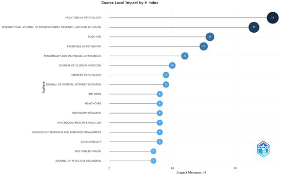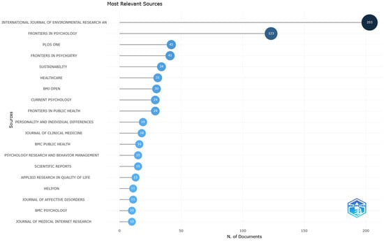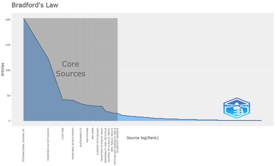In the context of this paper’s analysis, Bradford’s Law of Scattering is applied to 14 sources within Zone 1. These sources include the International Journal of Environmental Research and Public Health, Frontiers in Psychology, PLOS ONE, Frontiers in Psychiatry, Sustainability, Healthcare, BMJ Open, Current Psychology, Frontiers in Public Health, Personality and Individual Differences, Journal of Clinical Medicine, BMC Public Health, Psychology Research and Behavior Management, and Scientific Reports, as illustrated in Figure 4.