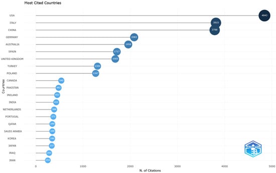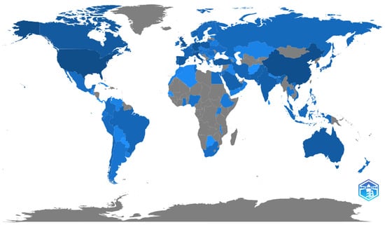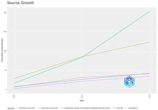 Figure 3 presents the top journals with more than 10 articles published on the topic. The International Journal of Environmental Research and Public Health claims the first position with 203 papers. It is an open-access transdisciplinary journal indexed in various databases, including Scopus, PubMed, MEDLINE, PMC, Embase, GEOBASE, CAPlus/SciFinder, and more, with a CiteScore of 5.4. The journal covers a range of disciplines, including Environmental Health, Environmental Sciences, Behavioral and Mental Health, Exercise, and Health-Related Quality of Life. There is a significant difference of 80 papers between the first and second places.