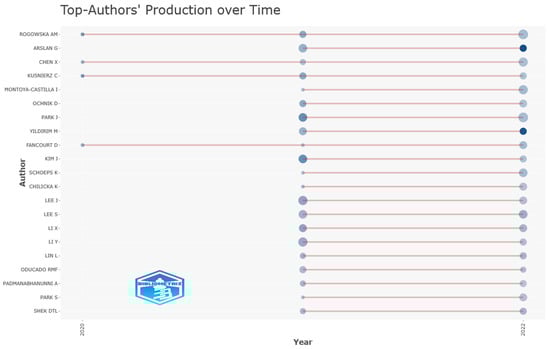 Table 5 provides key metrics for evaluating the authors who have contributed to the research on happiness and satisfaction during the COVID-19 pandemic. The analysis reveals a total of 8982 unique authors, who collectively account for 10,257 appearances across the extracted documents. In the bibliometric study conducted by Pang et al. [82] on happiness and satisfaction before and during COVID-19, the results showed that there were 5220 unique authors before COVID-19, between 2014 and 2019, and 3520 unique authors during COVID-19 (2020–2022).