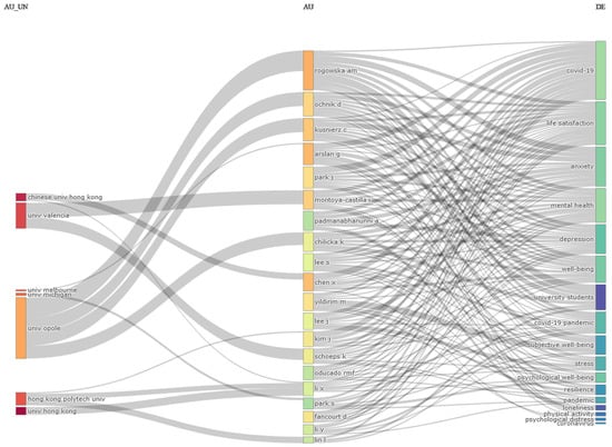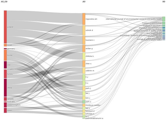 Below PLOS ONE, the differences in the number of papers are not as significant. The fourth journal, Frontiers in Psychiatry, is separated from the third position by only one paper. Other notable sources related to happiness during COVID-19 between 2020 and 2022 include Sustainability, with 34 papers, Healthcare, with 31 papers, BMJ Open, with 30 papers, Current Psychology and Frontiers in Public Health, both with 29 papers, Personality and Individual Differences, with 19 papers, Journal of Clinical Medicine, with 18 papers, BMC Public Health, with 16 papers, Psychology Research and Behavior Management, and Scientific Reports, each with 15 papers, Applied Research in Quality of Life with 13 papers, Heliyon and Journal of Affective Disorders, each with 11 papers, and BMC Psychology and Journal of Medical Internet Research, each with 10 papers.