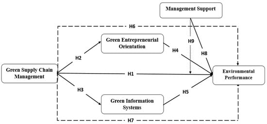 Second, according to Al shourah [24], the most significant component in adopting GSCM is management support at all levels. Upper management’s dedication is crucial for environmental excellence [25,26,27]. Moreover, the initial step towards success can be taken by top management through promoting employee involvement, fostering a cultural shift, enhancing knowledge management, and cultivating committed employees [28,29,30]. For these reasons, this study argues that management support is a crucial moderating variable to strengthen the relationship between GSCM practices and the ENP of firms. Nonetheless, the earlier scholars ignored how the GSCM and ENP relationship is moderated by management support (MS).