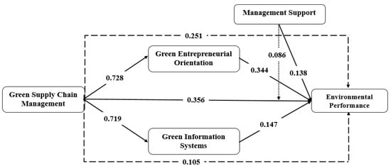 This study examines the mediating role of green entrepreneurship orientation and the green information system on green supply chain management and firms’ environmental performance relationship. It also investigates the moderating role of management support in the above association. The data were gathered from 355 manufacturing employees conveniently via a structured questionnaire administered during the survey. PLS-SEM was employed to analyse the data. Green entrepreneurial orientation and the green information system mediate the green supply chain management and environmental performance relationship. Equally, management support moderates the same association. The mediating role of green entrepreneurial orientation and the green information system and the moderating role of management support are the unique contributions towards green supply chain management and environmental performance association.