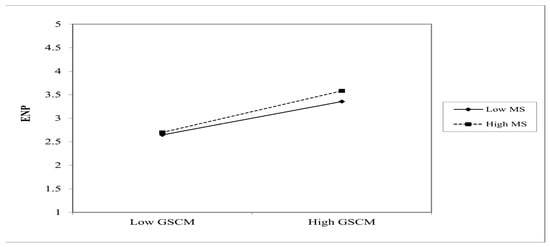 Furthermore, it is significant to mention that a positive correlation exists between MS and ENP. Additionally, MS functions as a substantial moderator in the relationship between GSCM and ENP. These findings validate hypotheses H8 (MS → ENP) and H9 (GSCM*MS → ENP). The effective acceptance and execution of advancements, such as innovative initiatives, activities, and technology, rely heavily on managerial support. Upper management must be completely committed to ensuring environmental excellence [25]. The moderation result provides a distinct contribution to the current investigation by deepening comprehension of GSCM and the manufacturing sector’s environmental performance. As far as the authors are aware, this study is one of the few that investigates how MS affects the association of GSCM and ENP.